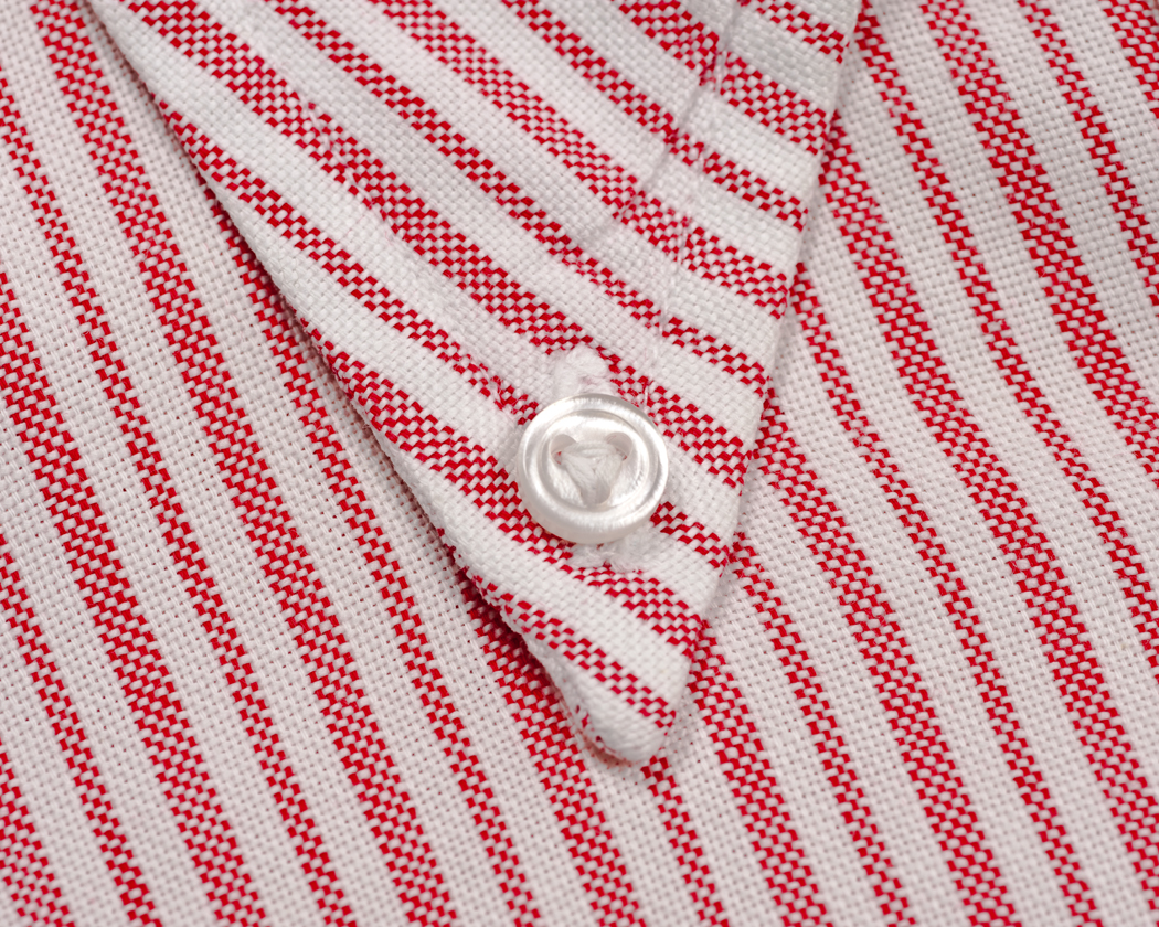 生地の柄は単なるキャンディーストライプでは無く、太い・細いのあるストライプ。アップで見ると、二本の糸を引きそろえて平織りしているのがわかります。