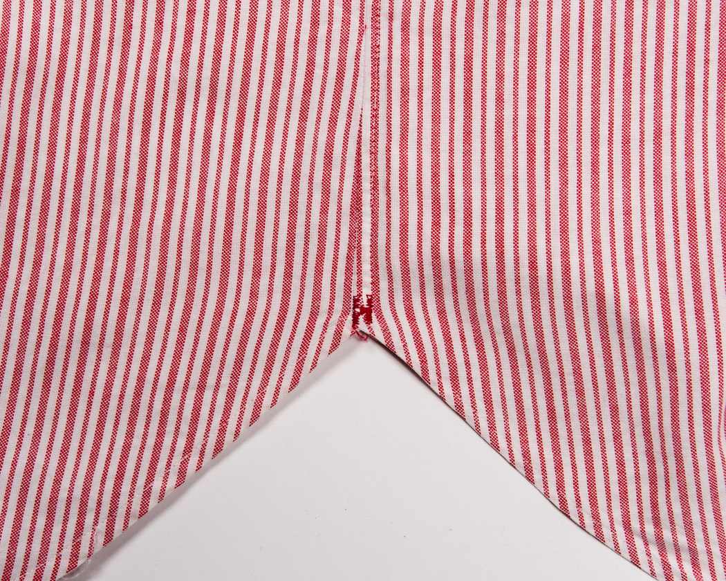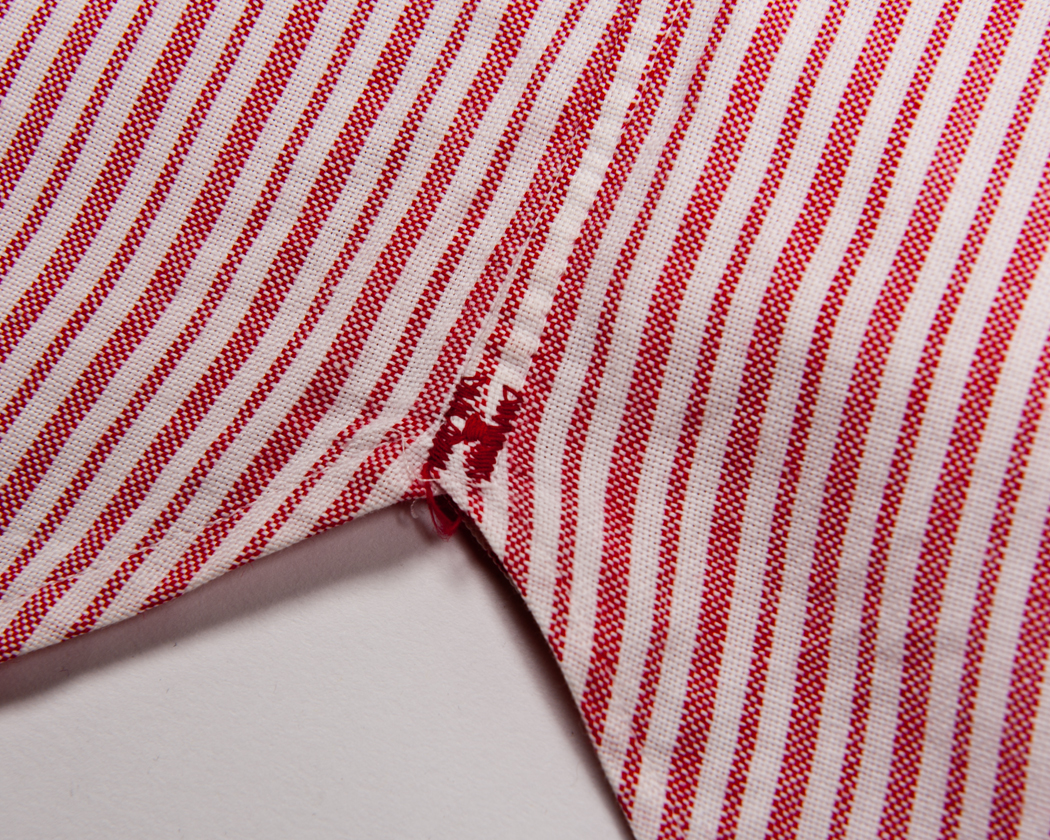 脇はシングルステッチで2回縫われているのですが、先に裾を縫ってから脇を縫っています。そのため、縫いじまいがこのHの刺繍が入る部分に成り、補強にもなっています。