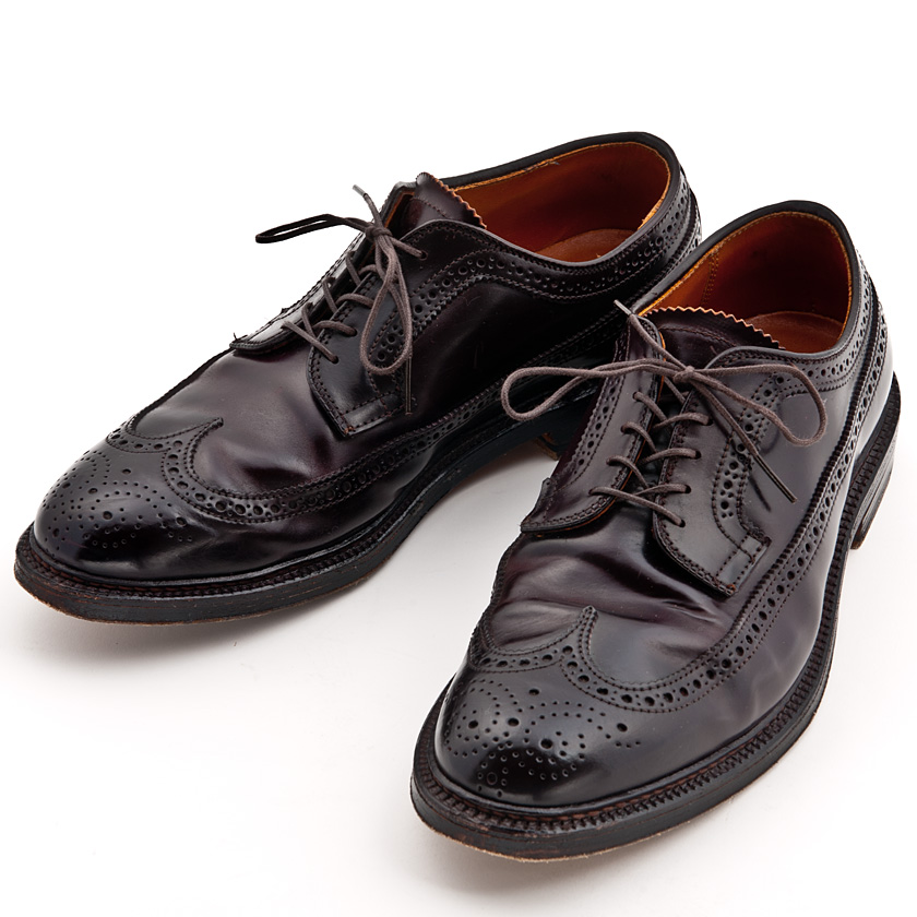オールデンのロングウィングチップ。素材は、バーガンディー色のコードバン。木型(ラスト)はBarrie Last(バリーラスト)。