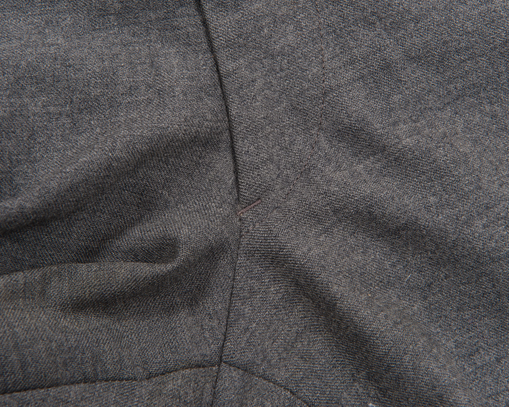 前立ての端はロック始末。このロック糸も細く、華奢な印象。腰裏は手まつりで始末されています。