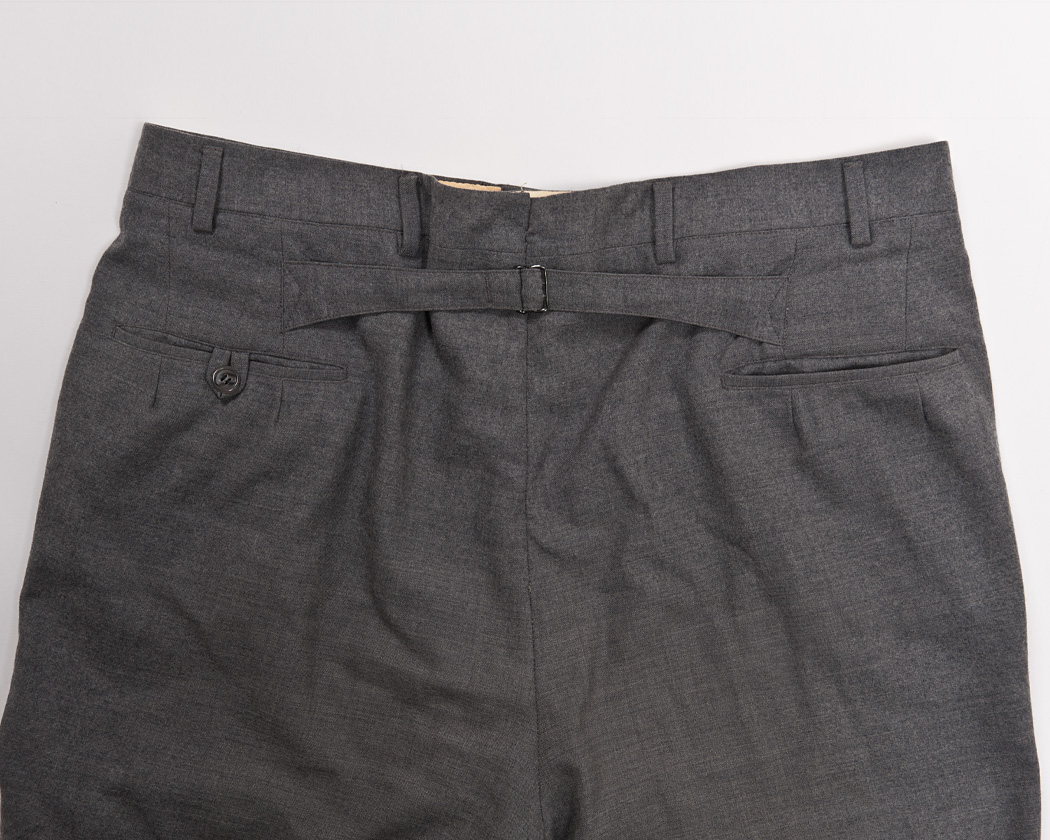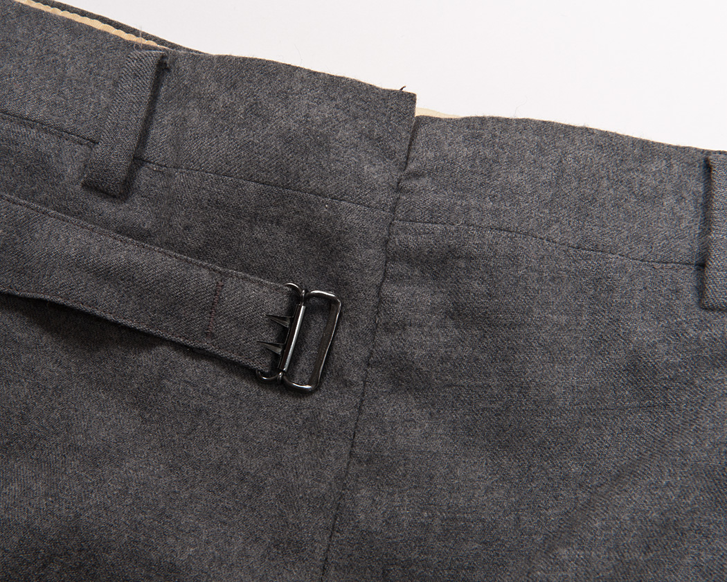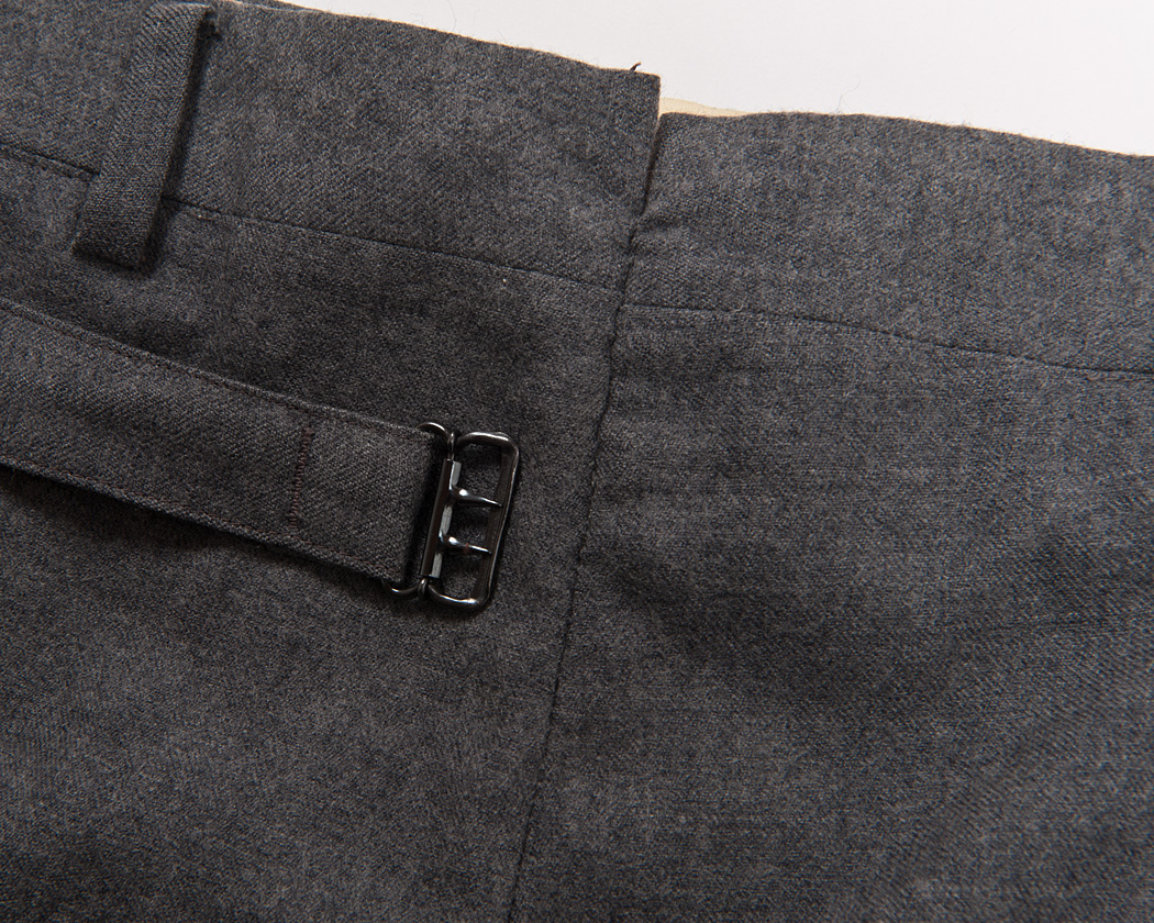 さらに、左側のポケットにはポケット口を止めるタブとボタン。シンチがついたストラップは、根元をダーツの一本に流し込んで始末されています。