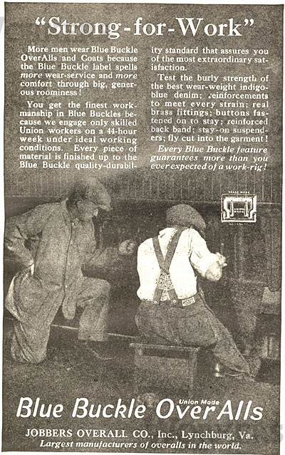 ブルーバックルオーバーオールズの1919年ロコモーティブジャーネルという鉄道員向けの雑誌に掲載された広告です。