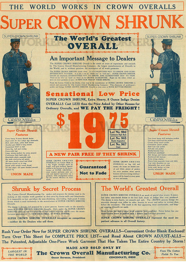 ”ディラーへの大事なお知らせ”として、自社の”Super Crown Shrunk Overall”は決して縮まず、色落ちもしない事を保障し、万が一の場合は交換することを誓っています。