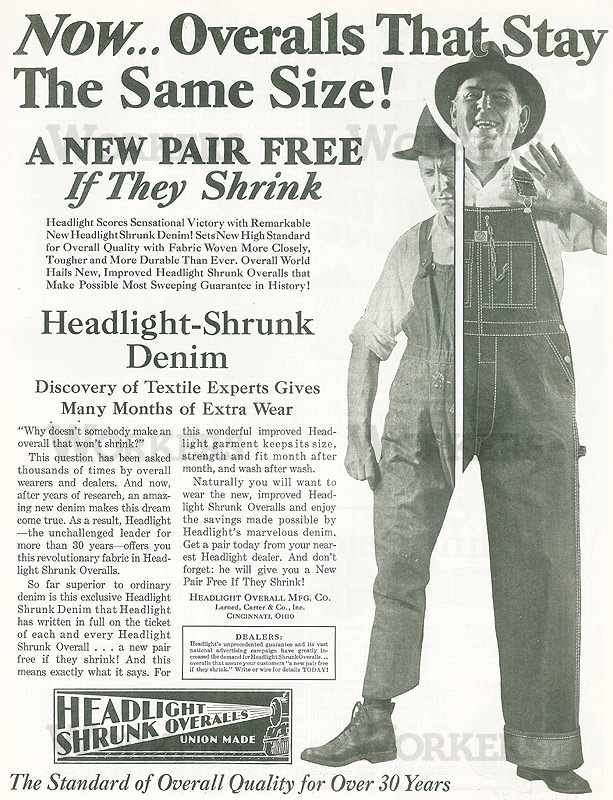 Shrunk、つまりあらかじめ縮めてしまって、これ以上縮みの無い生地、この発明のおかげで、長年着こんでも、サイズは買ったときのまま。