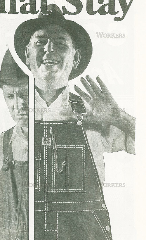 HEADLIGHTのラベル、セーフティポケットに入っていく懐中時計の鎖、サスペンダーの形状、ワークウェアの特徴・ホワイトステッチなどが通常の写真以上に、鮮やかに、描き出されています。