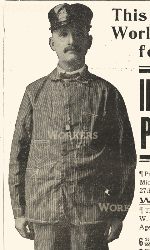 注目は、ウォバッシュプリントらしき、細い丸の点描生地で作られたレイルロードジャケットです。