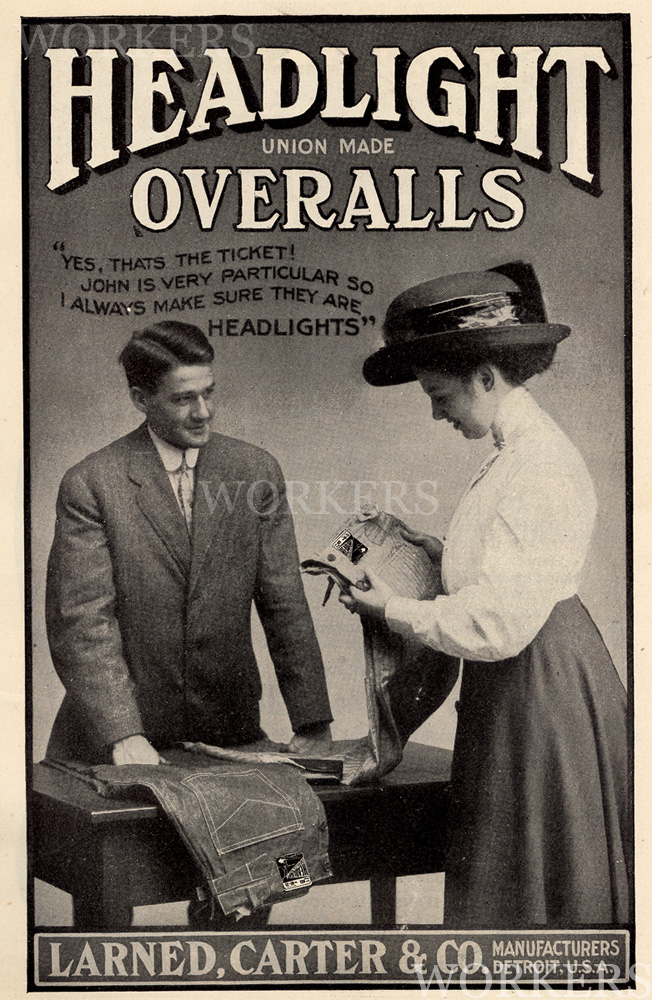 そして、ご婦人の持つオーバーオール、この生地も怪しげなストライプです。単なるヒッコリーなのか、はたまたより変ったストライプ生地なのか。
