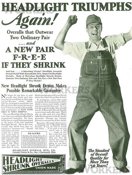 ヘッドライトのオーバーオールに、Stifelという会社のウィーバッシュプリント生地(ストライプ生地の名前)で作られた帽子をかぶった陽気なアメリカンが登場しています。