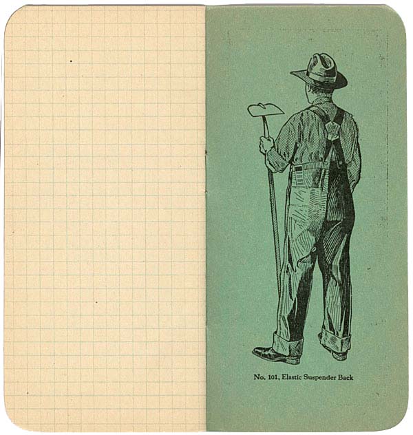 裏表紙側には、製品番号101、”Elastic Suspender Back”と銘うつゴムを使ったサスペンダー吊りのオーバーオールが紹介されています。