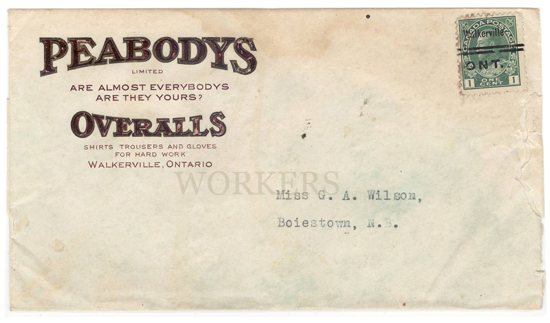 封筒には、メーカー名PEABODYS OVERALLSと、所在地、Walkerville,Ontarioとあります。