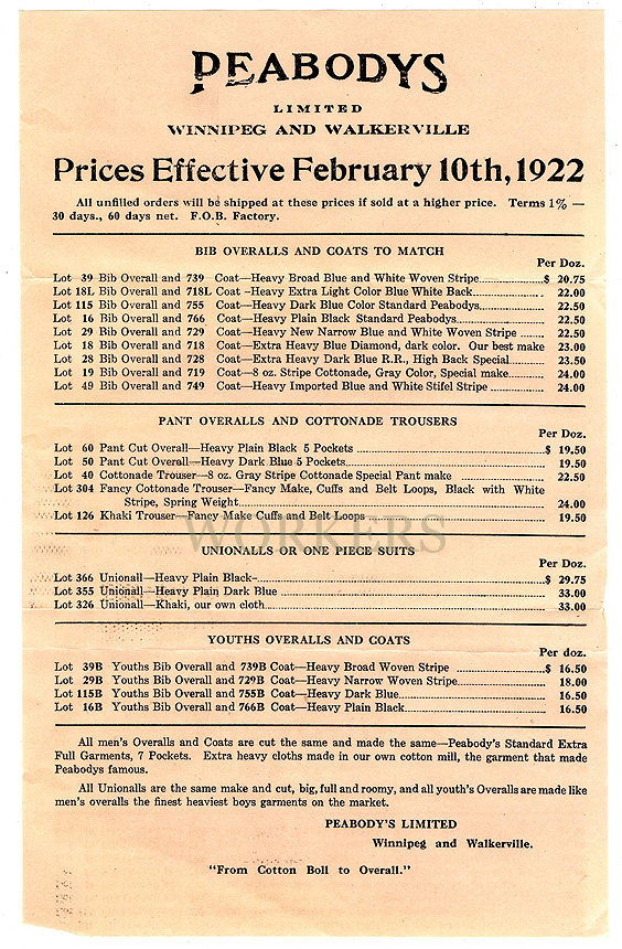 1922年、カナダのPEABODYS OVERALLSのプライスリストと封筒です。