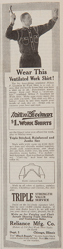 1915年6月2日号、ザカントリージェントルマンより、リライアンスMFG社、Milton F Goodman ワークシャツの広告です。この年代にして写真付き、さらに写真の解像度も高い貴重な広告です。