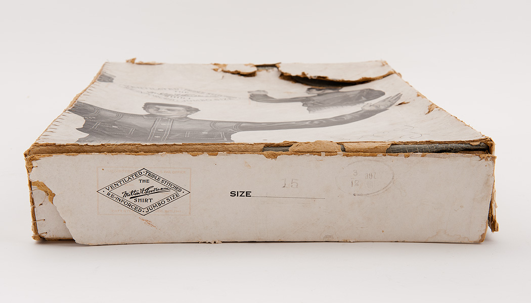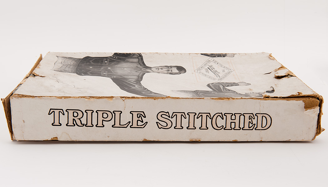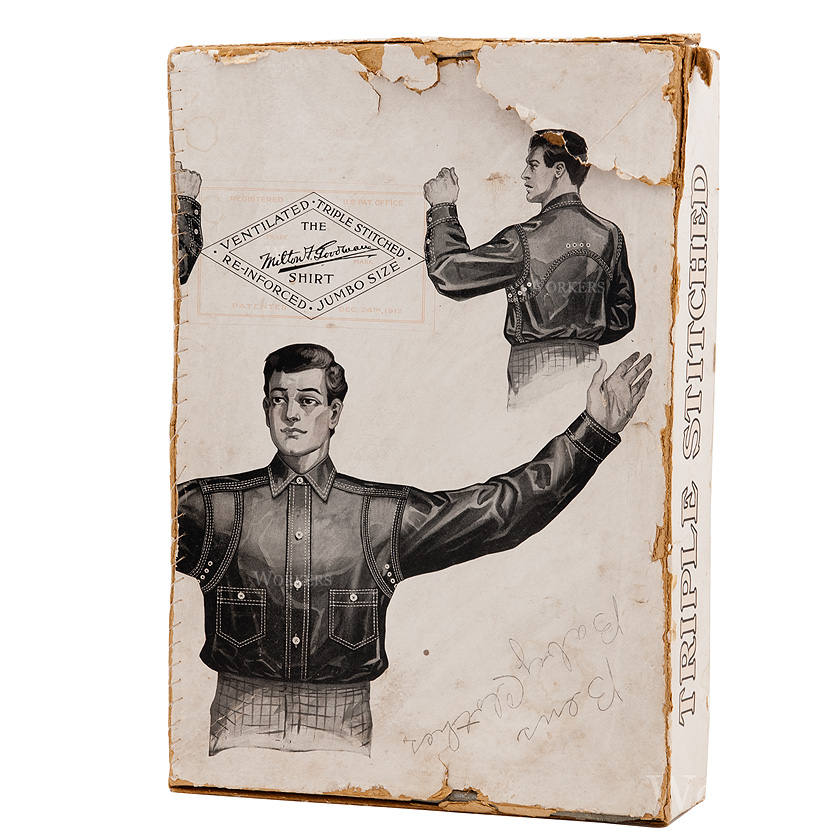 イラストで興味深いのは、この当時の定番仕様、V字ヨークに1ポケットのシャツに補強布を当てている事。実際、製品化されたMilton F Goodman Shirtではご存じのとおり、フロント2ポケット、バックヨークは湾曲した1枚ものに変更されています。