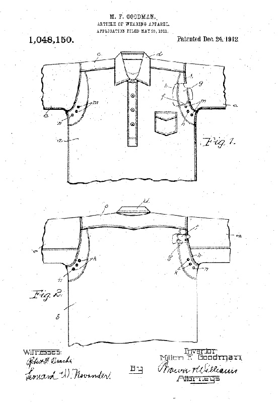 フロント・バックに補強布とそれを固定しつつ通気性を向上させるベンチレーションホールに関する特許です。InventorがMilton F Goodman本人。 当時40歳。