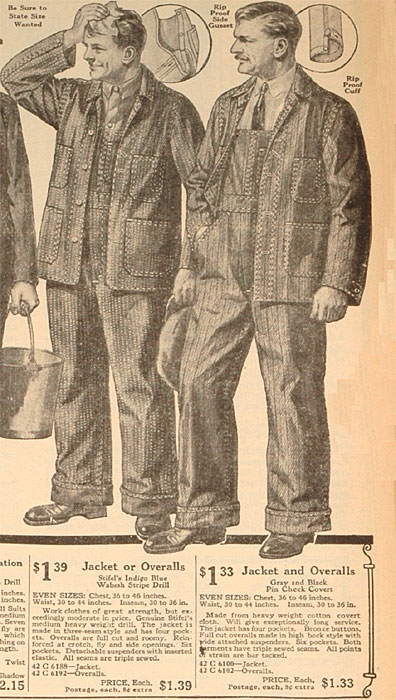 左:1ドル39セント、シュティフェル社・ウォバッシュストライプドリルのジャケットとオーバーオール。