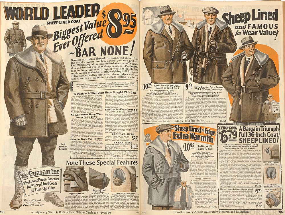 モンゴメリーワード・1928-29秋冬カタログから、シープスキンを裏張りしたコートを紹介します。