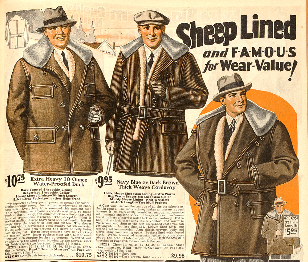 左から、10ドル75セント、防水10オンスダックのコート。身頃裏のシープスキンは”Bark Tanned”、Barkは樹皮という意味なので、渋なめしの事をさしていると思います。