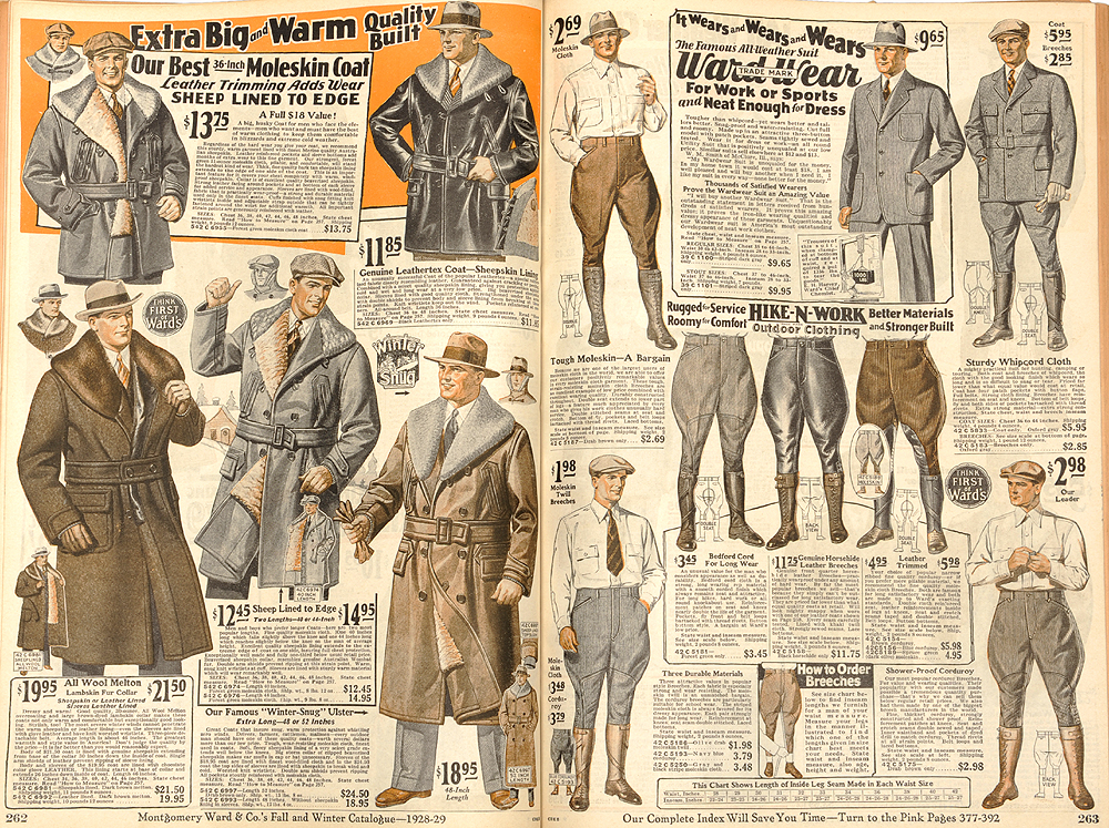 モンゴメリーワード・1928-29秋冬カタログから、シープスキンを裏張りしたコートを引き続きと、パッチポケットのスポーツジャケット、ジョッパーズ、ハンティングやキャンプに最適とあるノーフォークジャケットなどです。