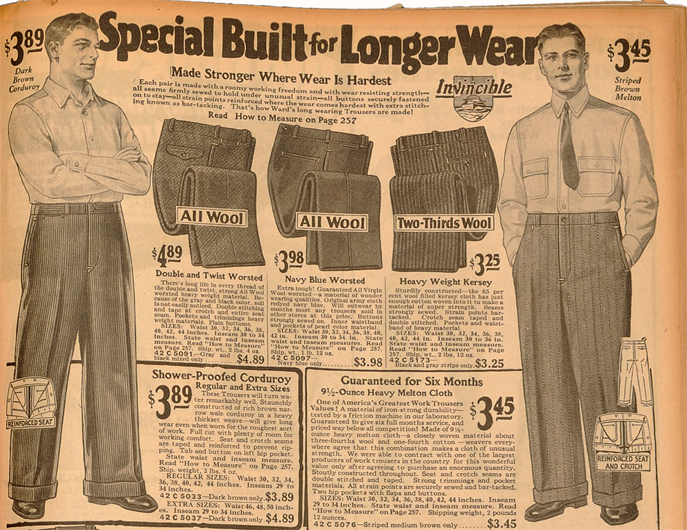 左、コーデュロイは最初に登場したトラウザーズと同じく、尻ぐりと股ぐりに補強のテープが入っています。ウェスト30-44まででも3ドル89セント。