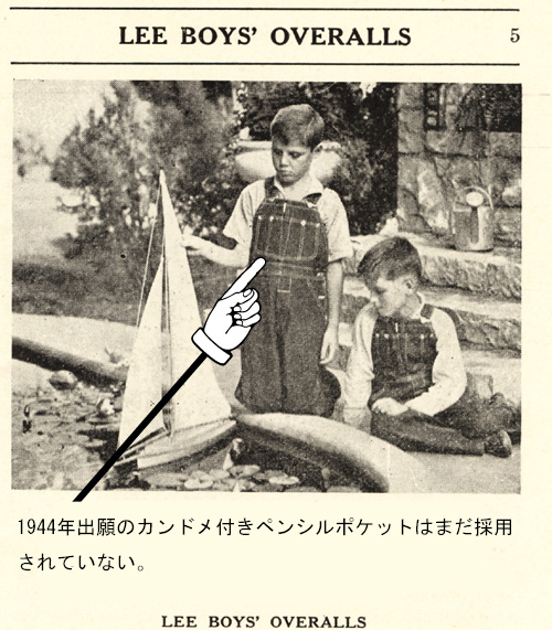| 1936年のオーバーオールの背当て特許、1938年のサスペンダーループに関する特許、いずれも特許登録済であることが宣伝文にうたわれている。 |