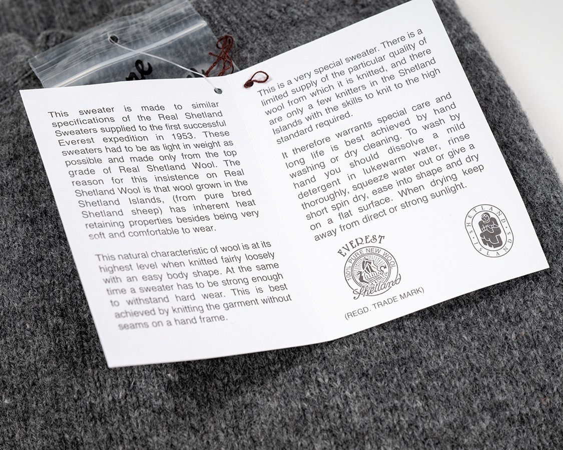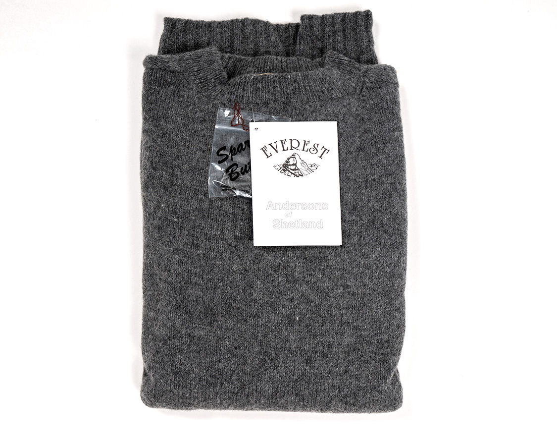 「1953年、エドモンド・ヒラリーがエベレスト初登頂の時にアンダーウェアとして着ていた」伝説から、通称「エベレスト」と呼ばれている丸首のセーター。