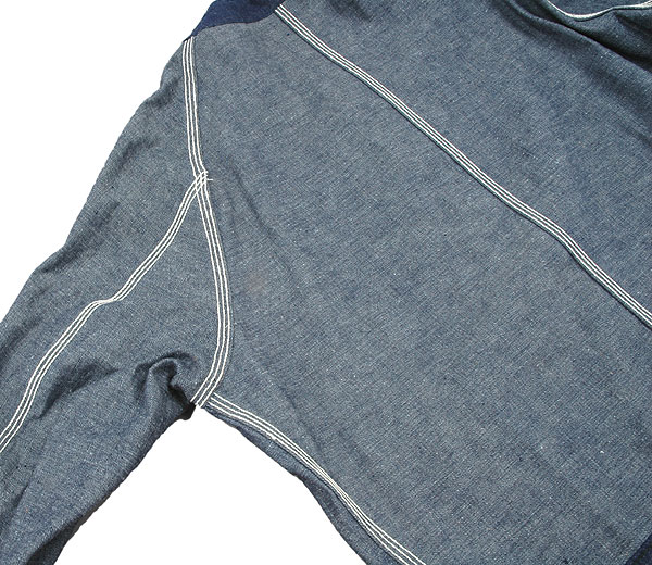 巻き縫いは、一度にロックをかけることも無く縫えるため縫製効率が良く、ワークウェアにはしばしば使われています。