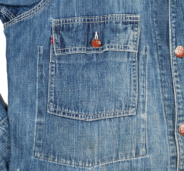 わずかに覗いたポケット、ここにも赤いカンヌキ留めが見えます。