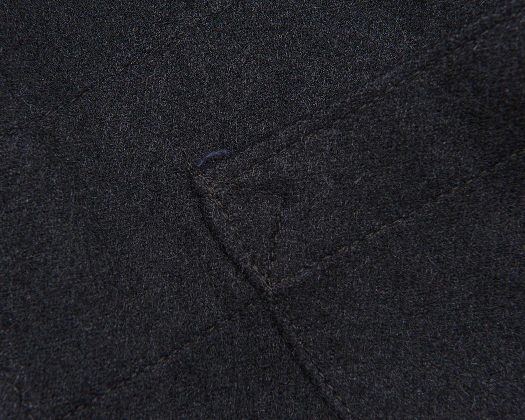 見返しがたたきつけられたステッチ、ポケット付け部分の補強用のスレキを当てたステッチが見えます。