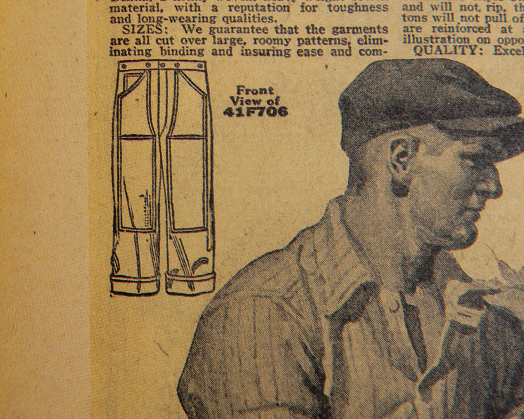 ブランドはSR Bestというシアーズの別ブランドですが、今回のパンツとほぼ同じデザインの一枚。今回のパンツもおそらく1920-30年代あたりの一枚だと推測しています。