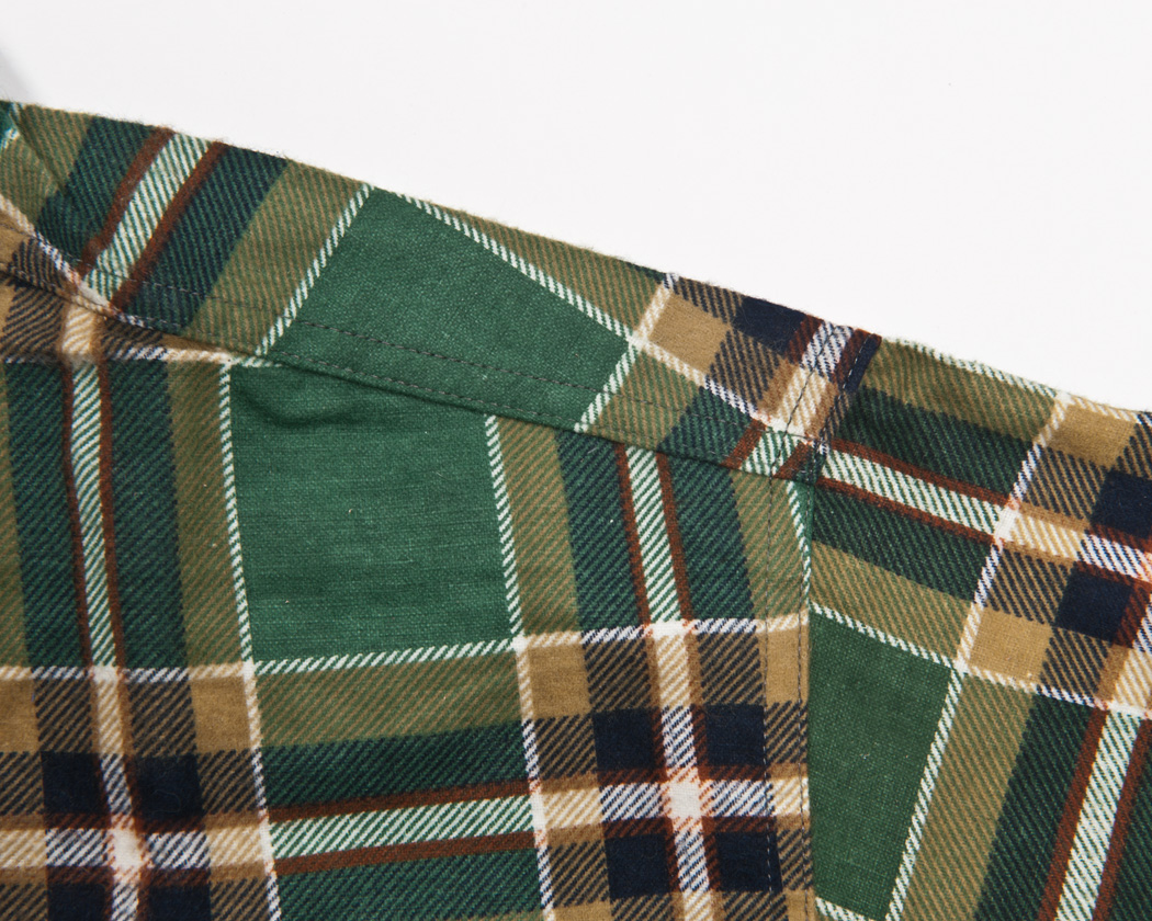 台襟の無い襟。形も直線的で、芯が入りステッチも一本だけ。