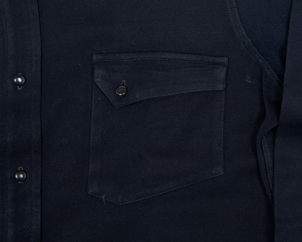 ボタン留めのフラップがつき、独特の流れるような形はウェスタンシャツならではとしか言いようのない雰囲気です。