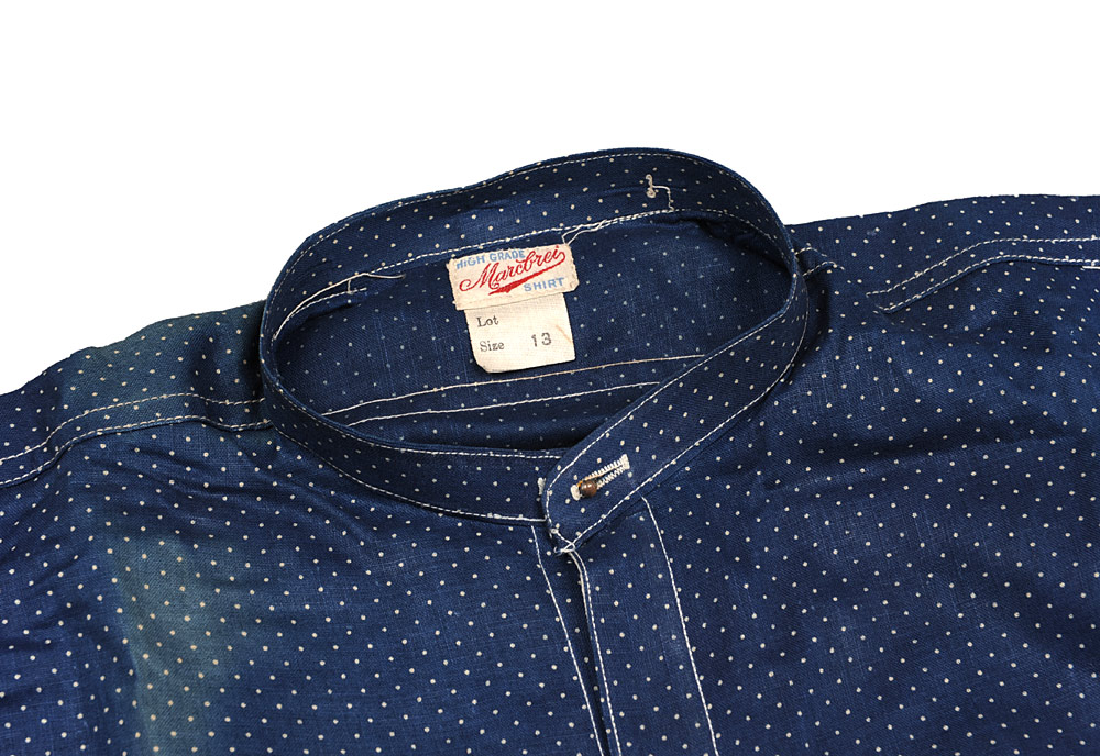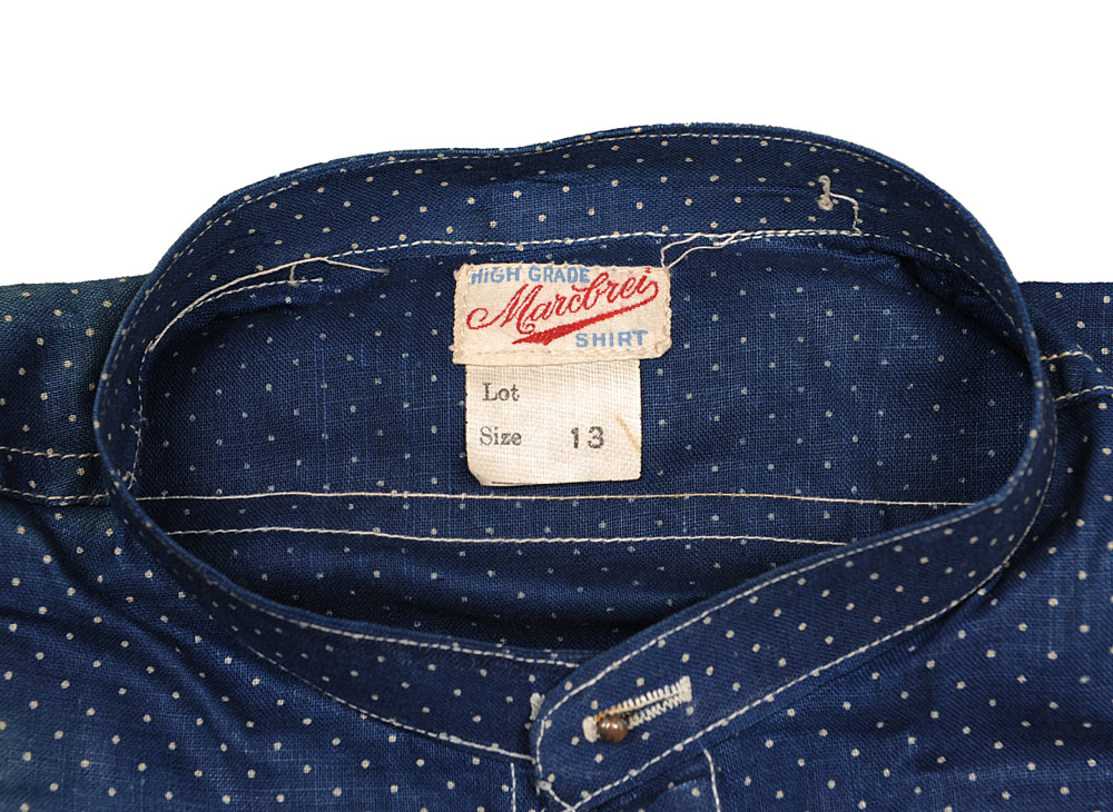 一方で、ポルカドットの場合は、生地をインディゴで染めており、また、生地を構成する糸自体も細いため、比較的糸の芯まで染まっているようで、色落ちしたビンテージもジーンズのようなはっきりとした縦落ちはしていないことが多いです。