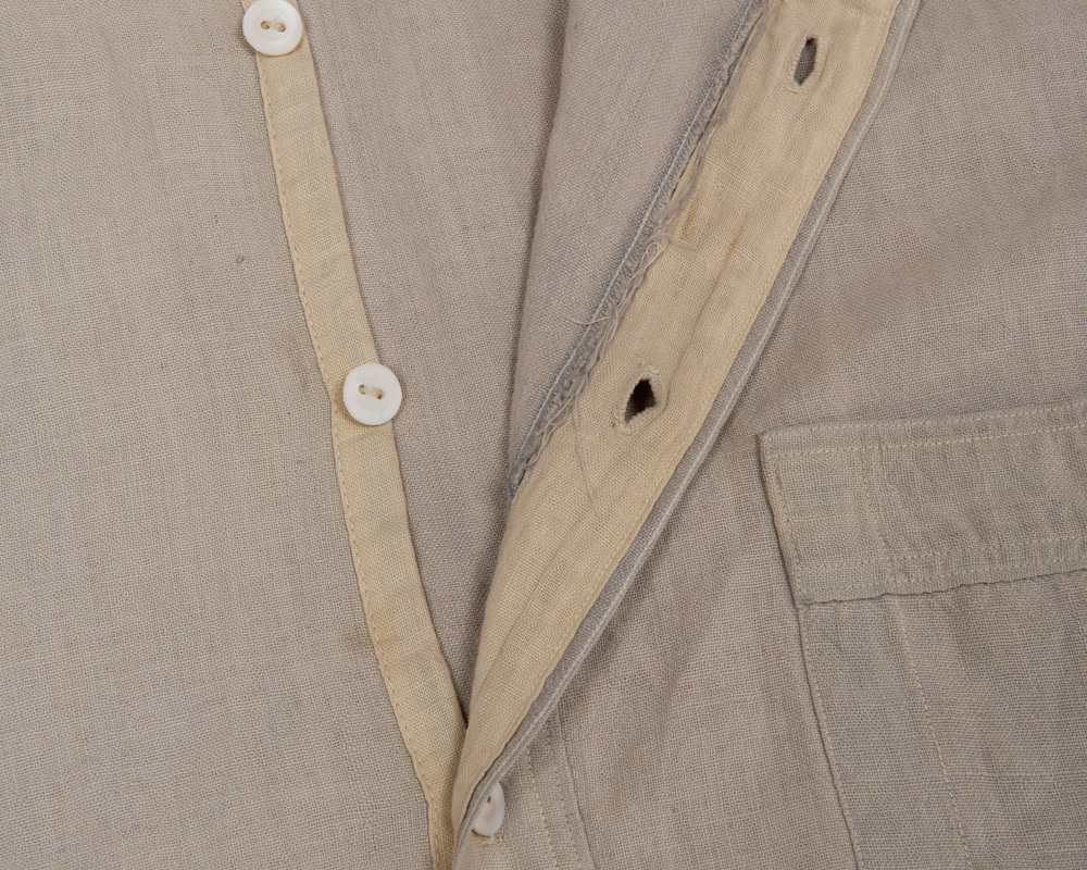 上前側はやはりガーゼのような布と別布で前立てを作っています。これと同じ仕組みをポケット口、そで口開きの角型ケンボロにも使っています。