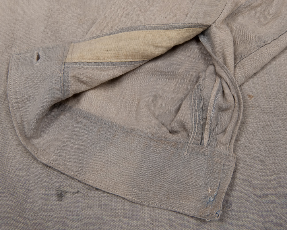 また、脇の巻き縫いのステッチがカフスに乗っています。これは、巻きの入り口部分を仮留めかなにかしておいて、先にカフスをつけてしまい、あとから無理やり重ね縫いから初めて巻いて行っているためです。