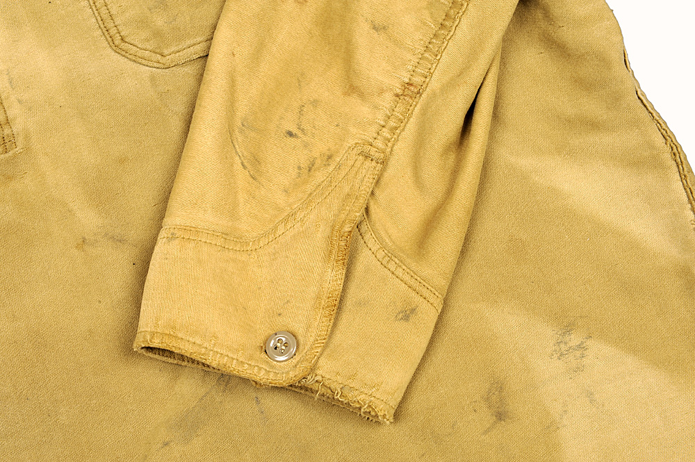 袖、二本針のパッカリングの激しさにも注目です。そで口のボタンは、他の部分と同じく、近年付け替えられたように見えます。