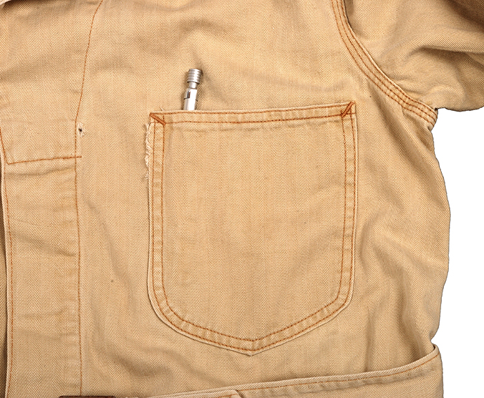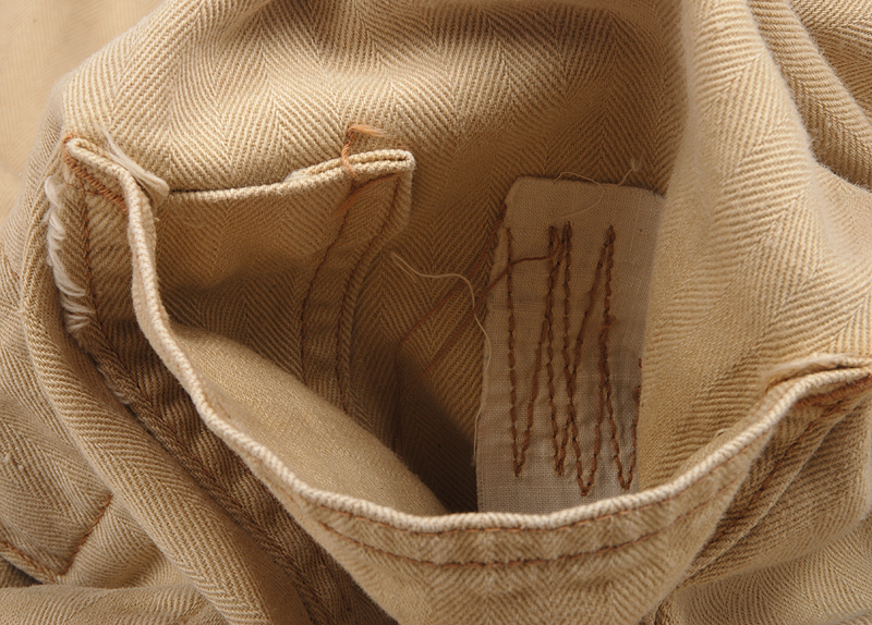 ペン刺しと、真っ白な布になってしまったユニオンチケットと思わしきラベルがダブルステッチでラフに縫い付けられています。