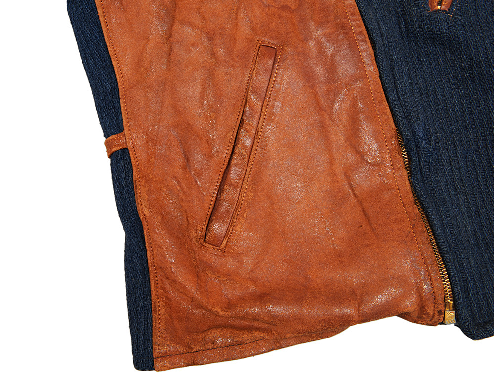 腰のポケットはレザー部分に、片玉ブチで作られています。