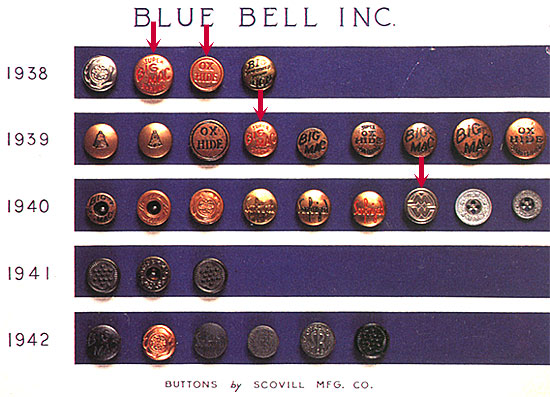 ボタンには、ブルーベル社が誕生するより前の時代の物も有り、その中にビッグマック(BIGMAC)、オックスハイド(OXHIDE)、更にPCペニーのライバルとも呼べるモンゴメリーワード(MW)、シアーズ社のストロングリライアブルまで登場しています。