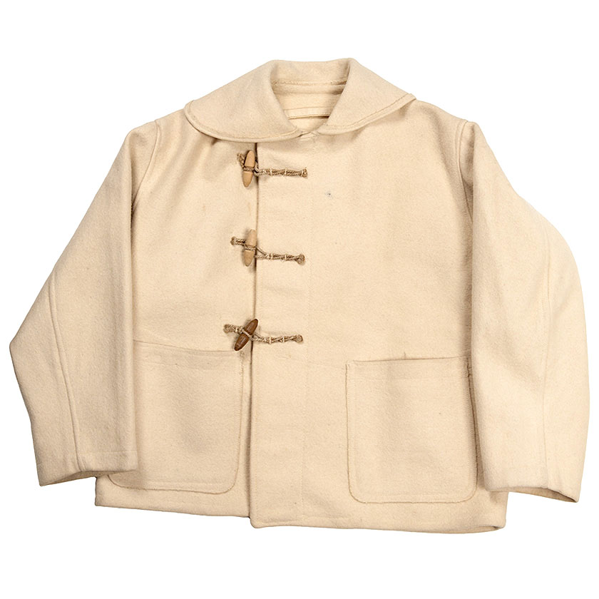 短い着丈、丸襟、そしてホワイトの色が最大の特徴。フロントがトグル、その裏に補強布といった点は典型的なダッフルと同じです。