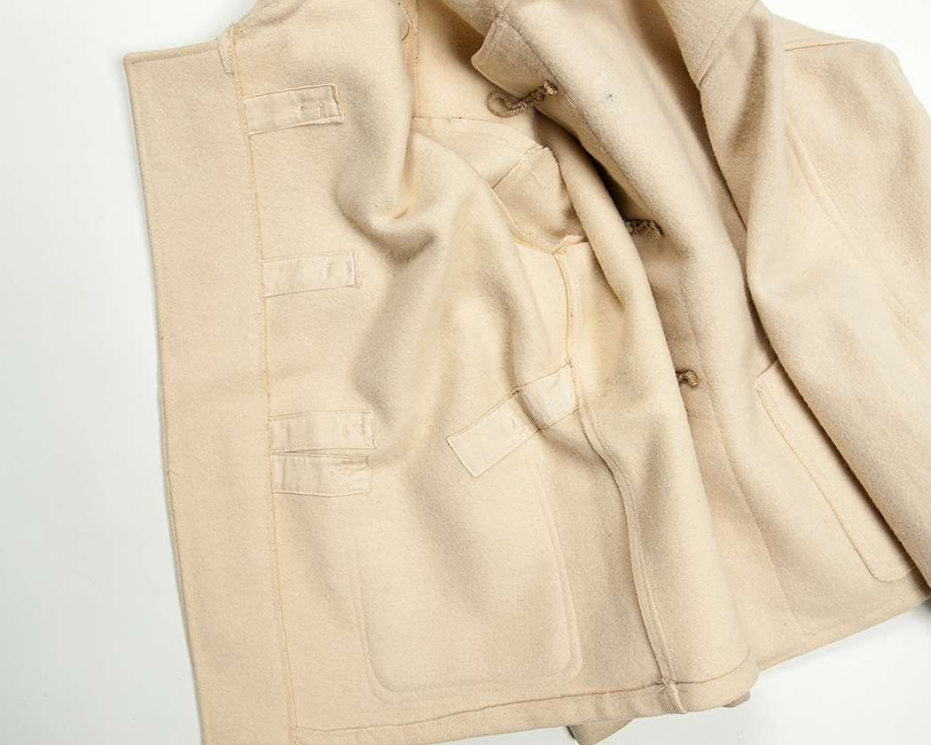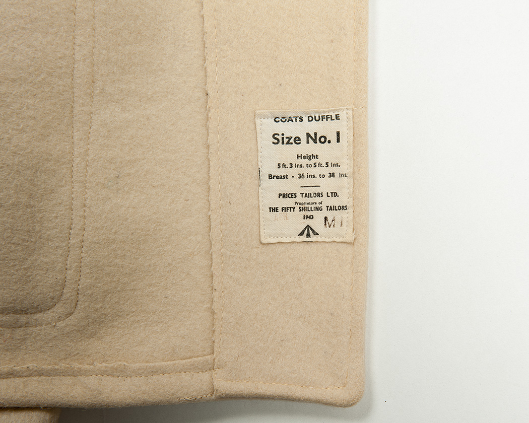 COATS DUFFLEと品名。サイズは1、適用する身長・胸囲の記載。