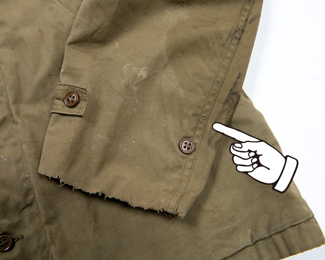 袖の縫い目にはカン止めが打たれています。これは裏地まで貫通しています。本来、着脱ぎした時に裏地が表地と大きく離れないようにステッチを入れたり、カフスをつけたり、もしくは「中止め」と呼ばれる見えない中で止める処理をします。それらの代わりにカン止めで止めるという処理が行われています。
