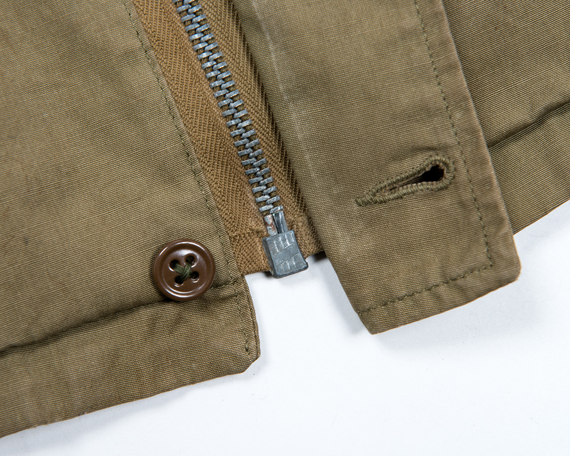 フロントはファスナー開き。ファスナー+フラップ。ただ、ファスナーの下側というか裏側には何もカバーになるものはなく、ジャケットの下に着た衣類にはそのままファスナーのムシがつく仕様です。