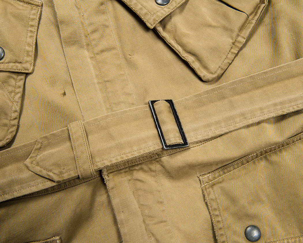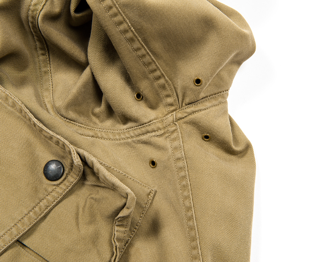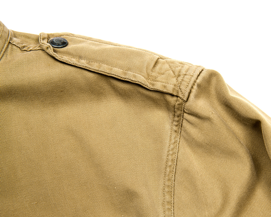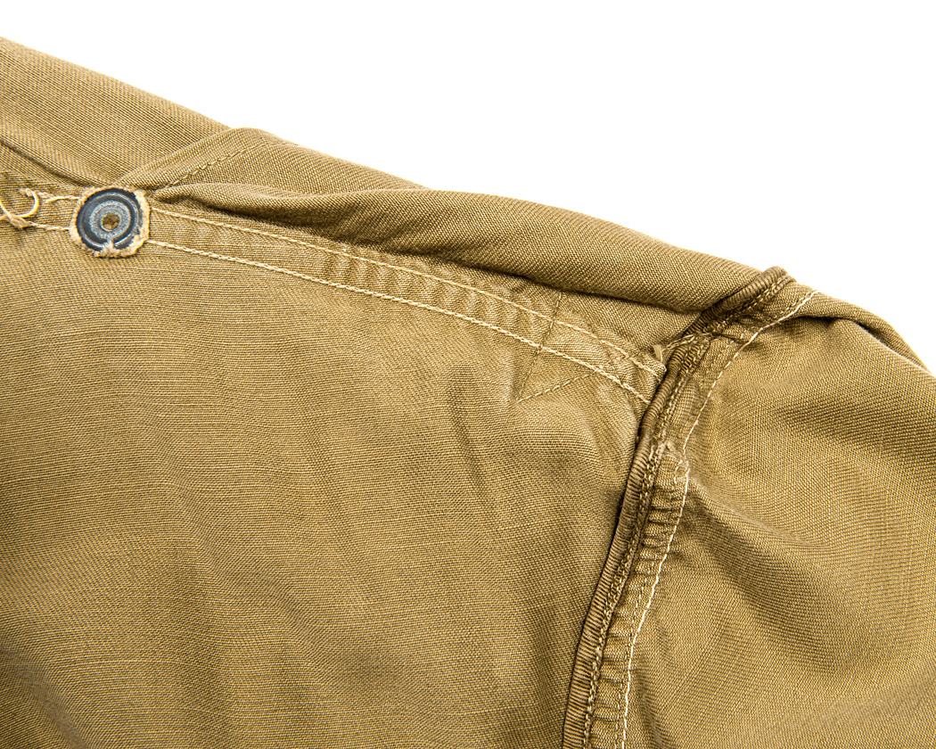 肩にはエポレット。袖ぐりはダブルステッチがかかっており、裏返して見るとパイピングと倒しのステッチが入っています。