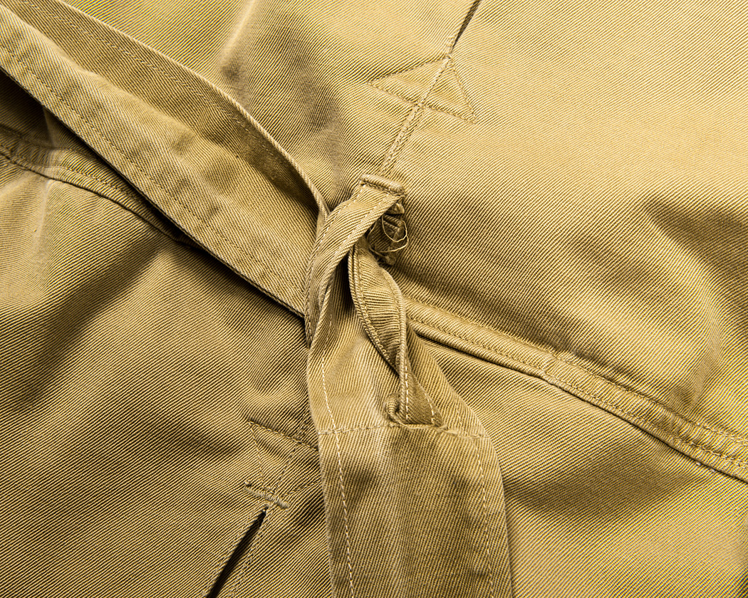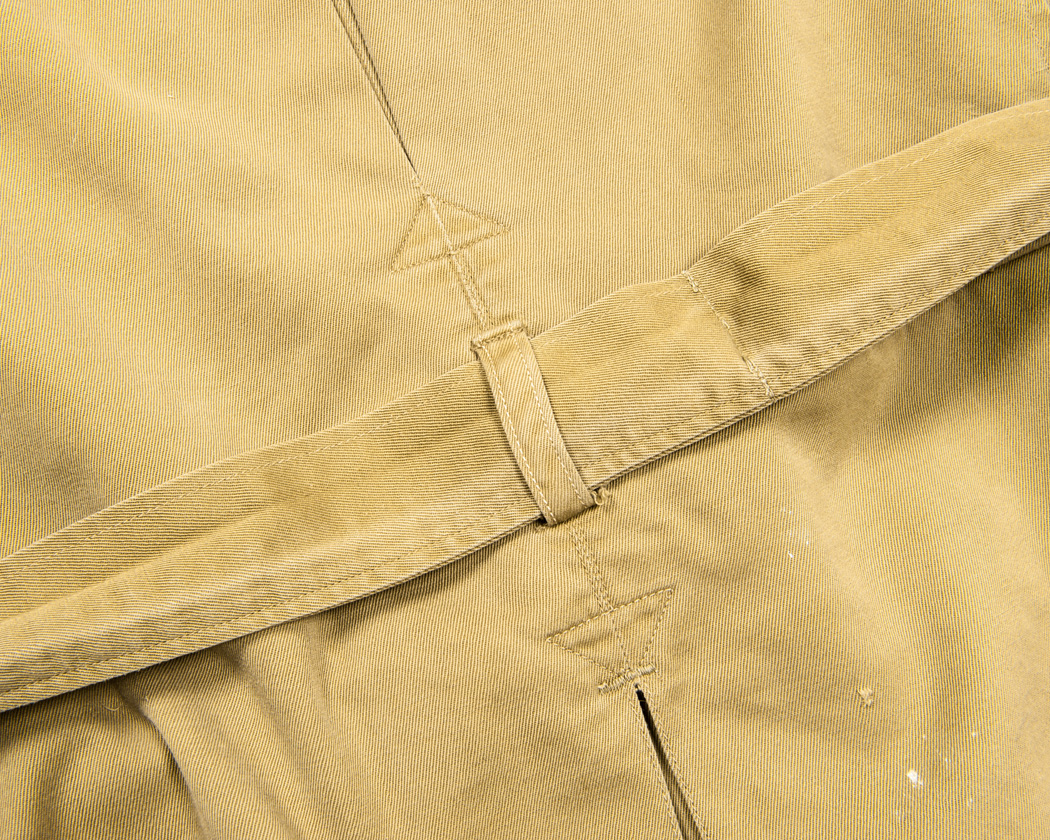 腰ベルトの裏、中心部分にはベルトが外れて無くなってしまわないように、身頃とベルトを止めつけてあります。