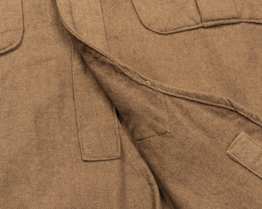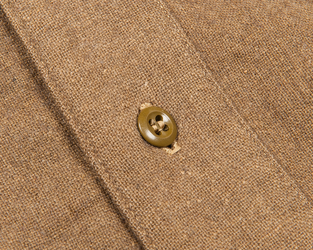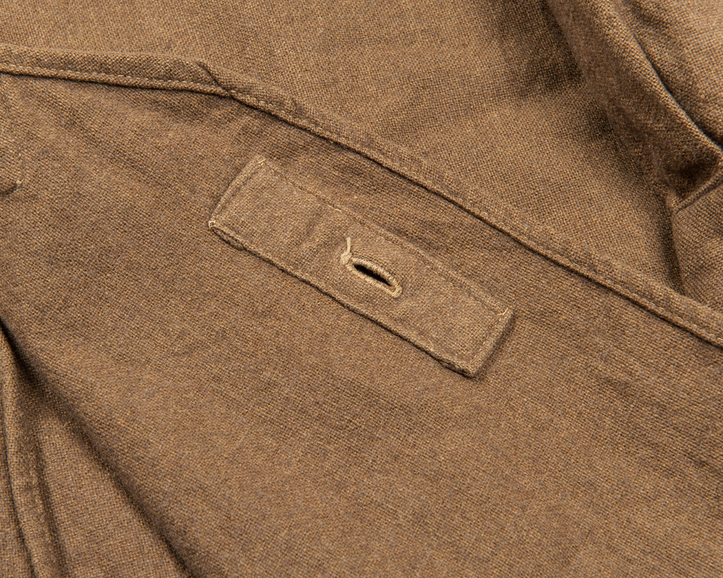 フロント湾曲部分。ここを左右止めるためのボタン。ボタンは交換されていますが、元々、この位置にホール・補強布はあたっていたようです。というのも、他の部分と縫製糸の色が全く同じだからです。
