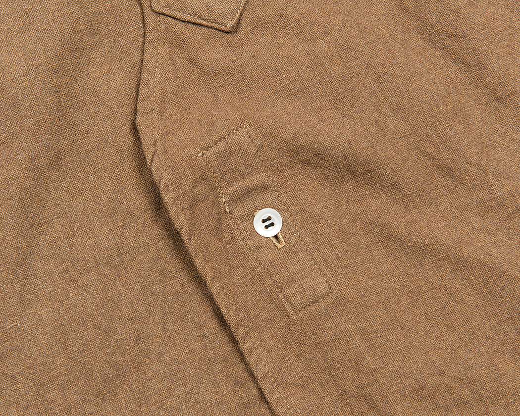 上前の裏を見るとすべてシングルステッチ。このあたり、アメリカ的なシャツとは違い、アイロン、平ミシンを使って縫われたものであることがわかります。