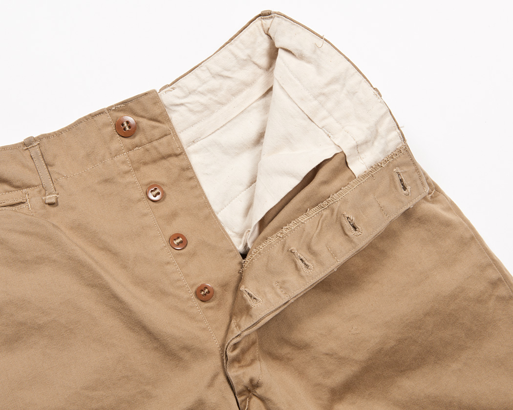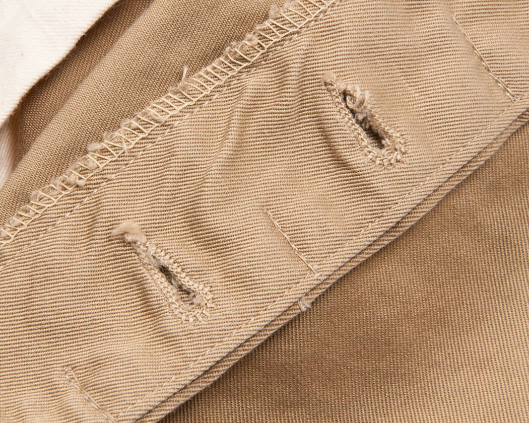 縫い目利用のポケット自体は、通常のチノでも見かけますが、この独特なステッチはほかでは私は見た事がない仕様です。以前から不思議に思っており、見返しがどのような形状をしているのか見てみると単なる四角形。本当に、ただただデザインでこの弓形のステッチを入れているのがわかりました。