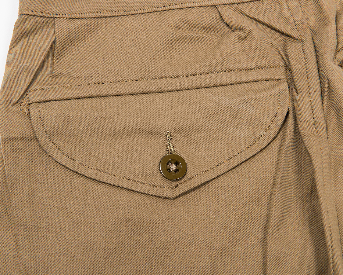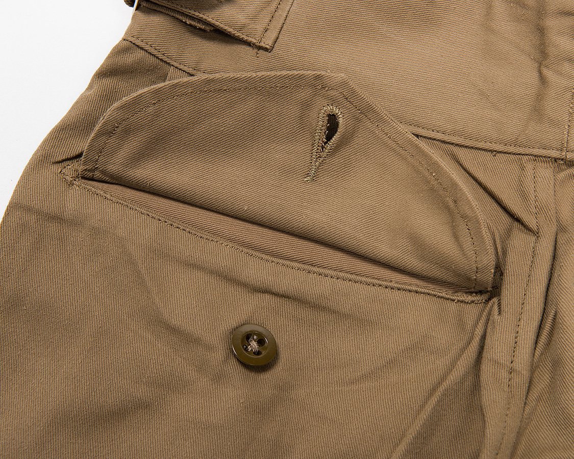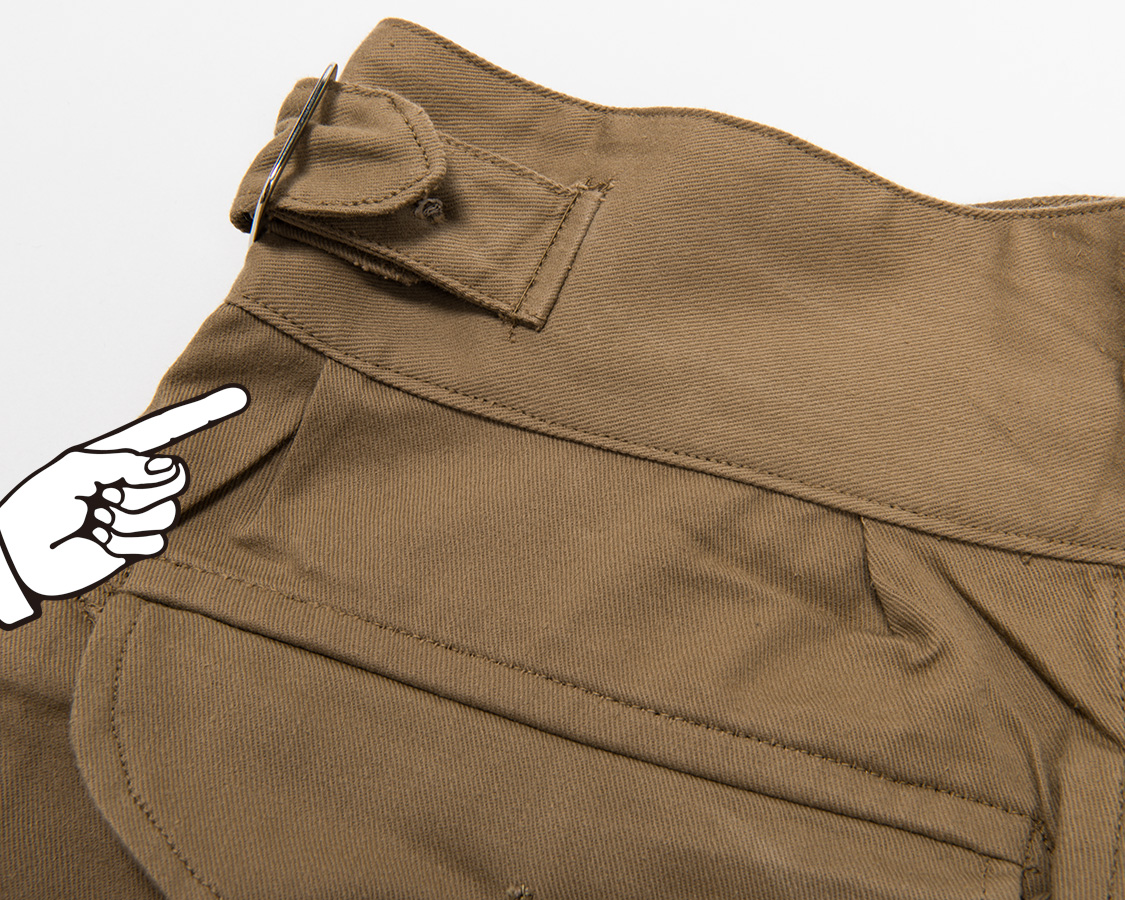 これが足りていない衣類で、運動着のような動きをするとヒップの縫い目が裂けます。後の時代には、伸縮性のある素材も開発されていきますが、コットンのドリル(チノ)という伸びのほとんど無い素材で体を動かしても吊らない、ステッチにストレスがかかりづらくするには全体的にゆったりと作る以外にありません。