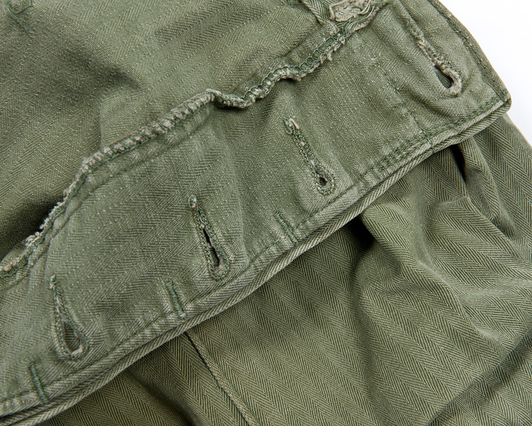 ボタンの打たれたモチダシは広く、その端にはホールが開けられています。ウェストに打たれたボタンで閉める事もできます。
