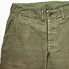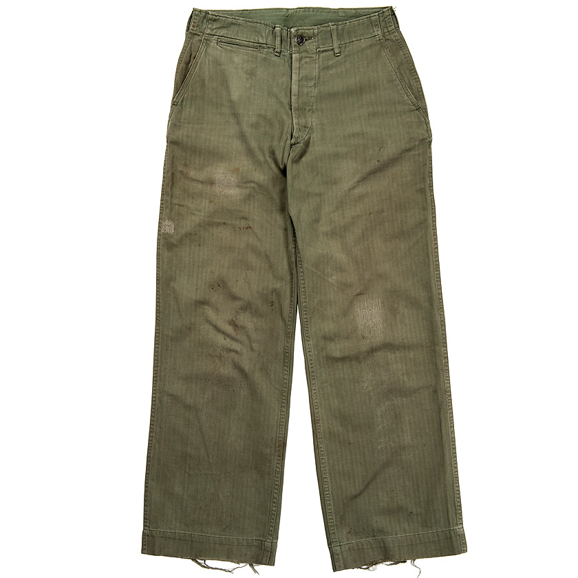 ヘリンボンのトラウザーズ。俗に41カーキと呼ばれるチノパンとディテールはほぼ同じでボタンが13スター。